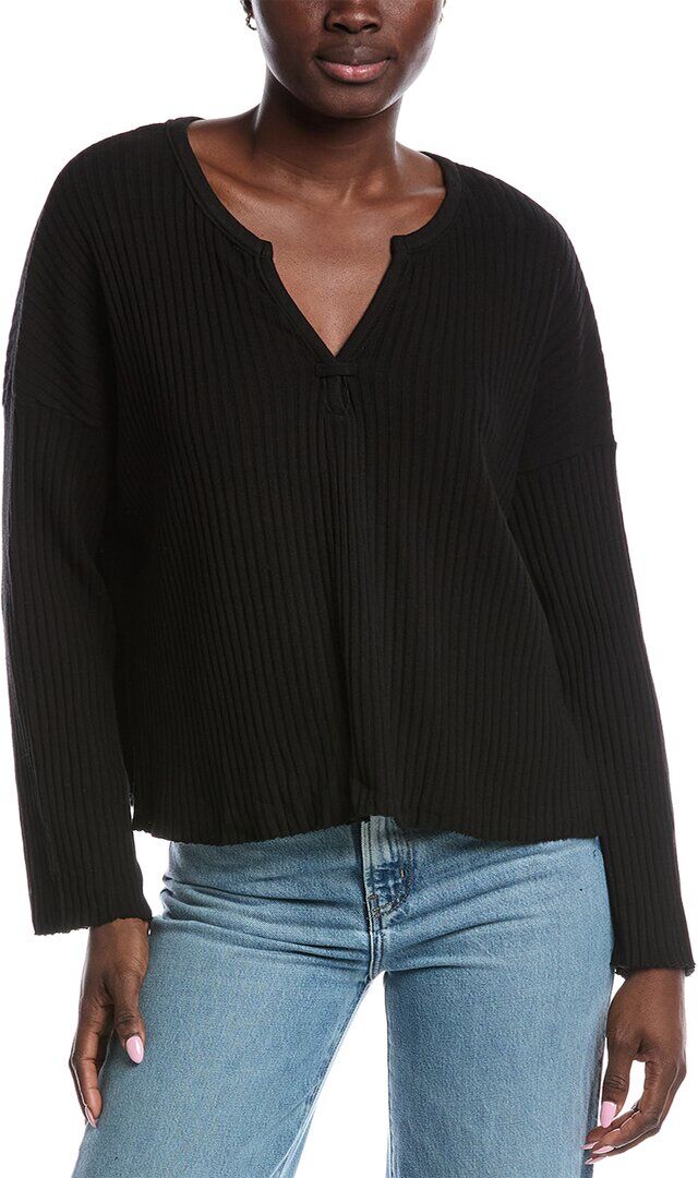 About the brand: Comfortable essentials made in LA. Getaway Notch Neck Sweater Rib Pullover in black with ribbed knit, split neckline, dropped-shoulder sleeves and side slits at hem Approximately 24in from shoulder to hem Model is 5'10 and is wearing